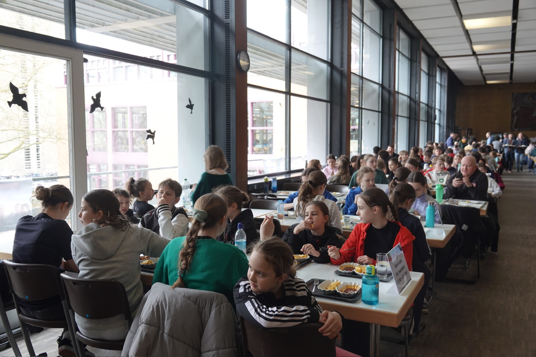Zwischendurch konnte sich wer mochte in den Trinkpausen mit frischem Obst stärken. Mittags ging es dann gemeinsam in die KIT-Mensa, wo jede:r etwas Leckeres aus der breiten Auswahl wie Schnitzel, Pizza, Currywurst und Pommes oder Pasta für sich fand. Und nach der vielen Bewegung am Vormittag war der Hunger groß!