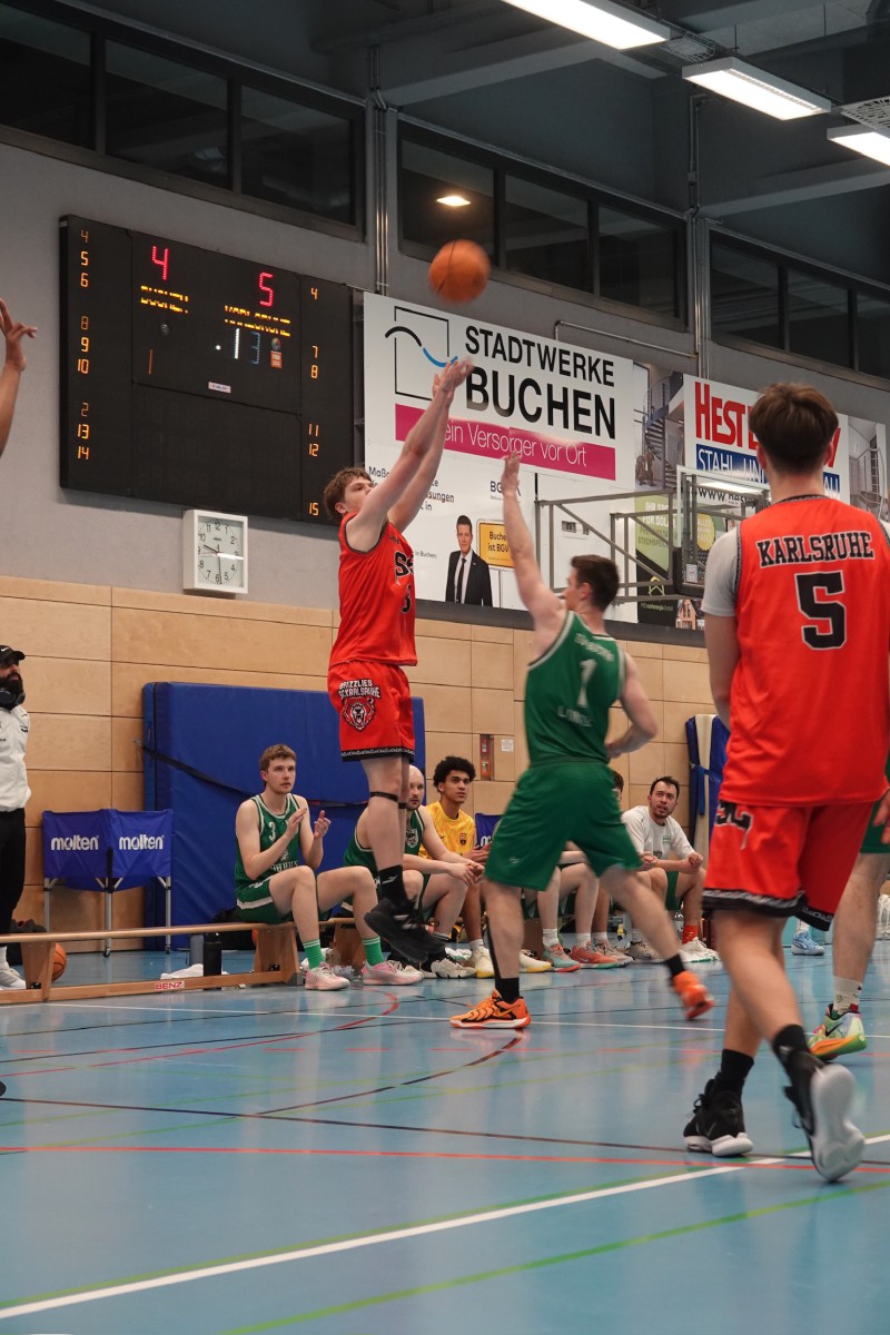 Doch die Rechnung der Buchener ging nicht auf – unsere Jungs trafen. Hatten sich die Buchener gegen Ende des ersten Viertels gerade noch eine kleine 1-Punkt-Führung erkämpft, stellte ein 15:0-Lauf in knapp 2 Minuten über die Viertelpause hinweg mit 5 Dreiern in Folge einen kleinen Schockmoment für die Buchener samt Publikum dar. Mit je einem Dreier von Max und Leandro schloss das erste Viertel, mit drei Dreiern von Ben begann das Zweite. Und auch wenn sich Buchen zur Halbzeit nochmals auf 7 Punkte herankämpfte (27:34), die Grizzlies gaben ihre Führung bis zum Ende nicht mehr her.