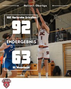 — Oberliga: Grizzlies gegen SG Mannheim am 31.01.26 — Einen unerwartet hohen Sieg holten sich die Grizzlies letzten Samstag gegen die SG Mannheim, den Tabellenzweiten der Oberliga Baden. Die Mannheimer, die dieses Spiel im Kampf um den Aufstieg unbedingt gewinnen wollten, begannen auch stark und gingen im ersten Viertel zunächst ...